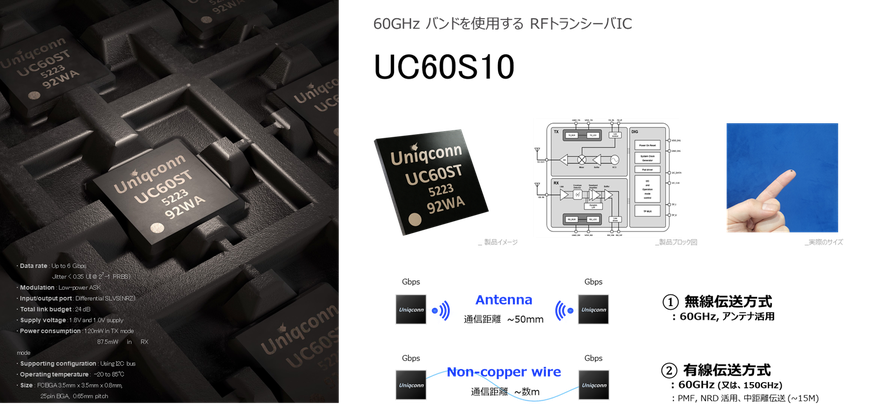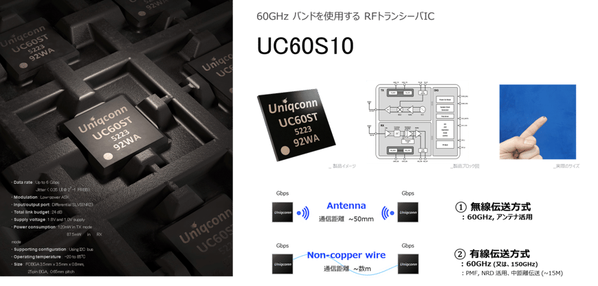 ブースでは、共同出展するUniqconn社製「ミリ波近距離無線デバイス」を用いた完全ワイヤレスソリューションをご提供します!リリース済のUC60S10の他、AiP(Anttena in Package)製品やマルチインターフェイスICなどの新製品を展示予定です。
